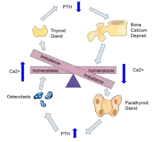 La hormona paratiroides induce un aumento de absorción de calcio tracto gastrointestinal y en el riñón. También induce la resorción de calcio y fosfato en el hueso por los osteoclastos.[15][11] También tiene un papel en la activación de la vitamina D desde su forma prohormona a su forma activa. La vitamina D es también responsable de aumentar los niveles de calcio en sangre y funcionando conjuntamente con hormona paratiroides. La vitamina D es en parte responsable de la inhibición de liberación de hormona paratiroides al unirse a receptores de vitamina D presentes en las glándulas paratiroides.