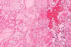 ![]() Microfotografía de un infarto de la placenta (a la izquierda de la imagen), una causa de la hipoxia intrauterina. Tinción de H&E. | ||