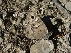 Se trata de una mariposa bastante grande dentro del grupo de las Satyrinae, alcanzando una envergadura de unos 6 cm. La cara inferior de las alas presenta unos tonos predominantemente grisáceos, que permite a esta mariposa pasar prácticamente desapercibida cuando se posa sobre los suelos rocosos que afecciona, donde resulta muy difícil distinguirla cuando se queda totalmente inmóvil. Confía entonces plenamente en su camuflaje y es posible, por ello, acercarse a escasos centímetros de ella. Destacan, en la cara inferior de las alas, una amplia e irregular banda gris-blanca zigzagueante, subrayada de negro, que atraviesa el ala de par en par y que contrasta netamente con el fondo más oscuro de la misma, así como grandes ocelos negros punteados de blanco y cercados por un anillo de color beige-amarillo. La cara superior es de tonos oscuros, marrón.