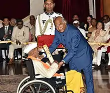 ![]() El presidente Shri Ram Nath Kovind le entrega el premio a Hiralal Yadav con Padma Shri | ||