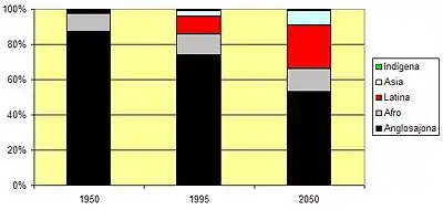 Se estima que en el año 2060 la población blanca no hispana sea solo el 43% de la población total de los Estados Unidos, mientras que la población hispana será de más del 30%. El resto serán afroamericanos y otras minorías, como las asiáticas, que también han tenido un crecimiento importante.[8] En el estado de California la población hispana ya es la mayoría, representando un 39% del total del estado, frente al 38% que representa la población blanca no hispana.[8]