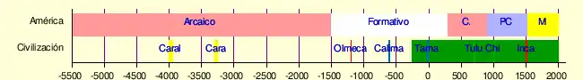 Durante el periodo arcaico (8000 a. C. - 1500 a. C.), el hombre americano descubrió la agricultura, a la par de otros pueblos en otros continentes. Ello tendría como consecuencia la sedentarización, la creación de sociedades más complejas y la construcción de ciudades. Caral-Supe situada en el actual Perú, corresponde a ese periodo con dataciones del 2627 a. C., es decir, casi a la par con las ciudades mesopotámicas, egipcias, indias y chinas.[2] Ese era el preludio que marcaba el fin de la Prehistoria de América y que daría origen a la Cultura Olmeca hacia el 1500 a. C., la primera gran civilización del continente cuyo esplendor iría hasta el 900 cuando San Lorenzo, su principal centro ceremonial, fue saqueado. La Cultura Olmeca se sitúa entonces en el llamado Periodo Formativo de América (también llamado Periodo Preclásico o Periodo Agrícola) y se desarrolló en Mesoamérica. 5.000 fueron los centros principales de esta primera civilización: San Lorenzo (datado del 1500 a. C.), Tres Zapotes y La Venta (el más grande centro urbano que podía albergar hasta 18 000 habitantes).