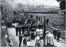 La Revolución de Asturias de 1934 fue una insurrección obrera que formaba parte de la "huelga revolucionaria" y el movimiento armado organizado en toda España conocido con el nombre de Revolución de octubre de 1934 y que sólo arraigó en Asturias,[46] debido fundamentalmente a que allí la CNT sí que se integró en la Alianza Obrera propuesta por los socialistas de la UGT y el PSOE, a diferencia de lo sucedido en el resto de España. De ahí que la forma de organización social y política de la Comuna Asturiana (nombre con el que también se conoce a la Revolución de Asturias, por sus similitudes con la Comuna de París de 1871)[47] fuera la instauración de un régimen socialista[48] en las localidades donde predominaban los socialistas (o los comunistas), como Mieres donde se proclamó la "República Socialista" o como Sama de Langreo, o el comunismo libertario donde predominaran los anarcosindicalistas de la CNT, como en Gijón y sobre todo en La Felguera.[49] Fue duramente reprimida por el gobierno radical-cedista de Alejandro Lerroux, contra el que se había lanzado la insurrección por haber dado entrada en el gobierno a tres ministros del partido no republicano CEDA, recurriendo, por decisión del general Franco que dirigió las operaciones militares desde Madrid, a las tropas coloniales marroquíes (los regulares del Ejército de África) y a la Legión procedentes del Marruecos español.[50]