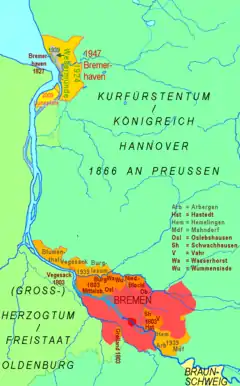 En 1888, la ciudad-estado Bremen (y la de Hamburgo) se incorporó a la Unión Aduanera Alemana, diecisiete años después de la unificación política. Ese mismo año se inauguró el primer puerto libre alemán. Las obras de corrección del río se finalizaron en 1895.