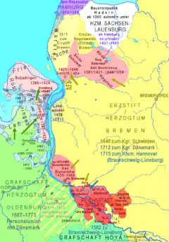 En 1411 los duques que gobernaban juntos en Sajonia-Lauemburgo, Erico IV y sus hijos Erico V y Juan IV, empeñaron su parte del castillo y bailío de Bederkesa al senado de Bremen, incluyendo todo "aquello que tengan en las jurisdicciones en la Tierra Wursten frisia y en Lehe (Bremerhaven), que pertenece a los anteriormente mencionados castillo y Vogtei".[5] Su parte en la jurisdicción, Vogtei (bailío) y castillo habían sido adquiridos de los caballeros de Bederkesa, afectados por la peste.[5] En 1421, Bremen adquirió también la mitad restante de los derechos de los caballeros de Bederkesa, incluyendo la parte que les quedaba en el castillo de Bederkesa.[4] Bremen volvió a ser expulsada de la Liga Hanseática en 1427.