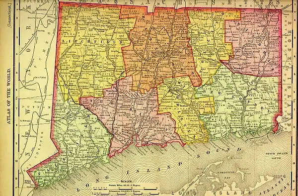 Según el Tratado de Hartford de 1650 con los holandeses, la frontera occidental de Connecticut fue al norte desde el lado occidental de la Bahía de Greenwich «a condición que la línea no esté dentro de 10 millas del Río Hudson». Sin embargo, la carta original de Connecticut de 1662 lo dio toda la tierra hasta el "Mar Sureño" (i.e., el Océano Pacífico).