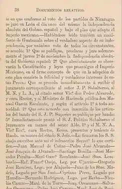 En la ciudad de Cartago a los veintinueve días del mes de octubre de mil ochocientos veintiuno, con premisas de las plausibles noticias de haberse jurado la independencia en la capital de México y en la Provincia de Nicaragua, juntos en cabildo extraordinario y abierto el Muy Noble y Leal Ayuntamiento de esta ciudad, los señores Vicario y cura Rector, el Ministro de Hacienda Pública, innumerables personas de distinción y pueblo, se leyeron los oficios y bando de señor Jefe Político Superior, don Miguel González Saravia de 11 y 18 de corriente en que conforme al voto de los partidos de Nicaragua se juró en León el día once del mismo la independencia absoluta del gobierno español y bajo el plan que adopte el imperio mexicano. Habiéndose leído también un manifiesto de Guatemala sobre el verdadero aspecto de su independencia, por unánime voto de todos los circunstantes, se acordó: 1° Que se publique, proclame y jure solemnemente el jueves 1° de noviembre la independencia absoluta del Gobierno español...Fragmento del Acta de Independencia de Costa Rica. 29 de octubre de 1821.