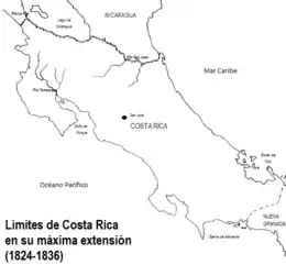 En 1573, con la desaparición de Garabito, el gobernador Alonso Anguciana de Gamboa consolidó la colonización del territorio, y se formaron asentamientos en las ciudades de Cartago y Espíritu Santo (actual Esparza), principalmente campesinos labradores.[75] La Gobernación de Costa Rica se extendió desde el río Tempisque y la margen derecha del río San Juan de Nicaragua, al oeste y norte, hasta la isla del Escudo de Veragua en Bocas del Toro y el río Chiriquí en el sureste. El dominio efectivo español sobre el territorio fue más pequeño: el Valle Central, la región del Pacífico seco, el Valle del río Reventazón hasta el Caribe central y parte del Pacífico sur. La capital provincial se ubicó en Cartago.[76] Talamanca, algunas secciones del Pacífico sur y las llanuras del norte (actual San Carlos) funcionaron como refugio para los indígenas, por su difícil acceso o falta de interés de las autoridades en controlarlas. Nicoya se constituyó en una Alcaldía Mayor con fuertes lazos con la Provincia de Nicaragua en parte cimentadas por el comercio ganadero. Entre 1570 y 1581 surgieron varias villas que se fundaron primeramente como pueblos de indios, a cargo de un corregidor y bajo el adoctrinamiento religioso de frailes franciscanos.[77]
