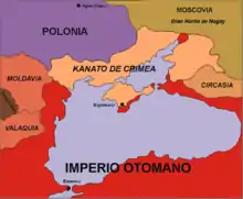 Los tártaros de Crimea controlaban las estepas que se extendían desde el Kubán hasta el río Dniéster, sin embargo, no tomaron el control de las ciudades comerciales genovesas. El Imperio otomano invadió las ciudades genovesas con tropas comandadas por Gedik Ahmed Pasha, que en 1475 pusieron a Feodosia y las demás ciudades comerciales bajo su control.[19] Después de la captura de las ciudades genovesas, el sultanato otomano mantuvo cautivo a Meñli I Giray,[20] quien fue liberado a cambio de aceptar el dominio otomano sobre los khanes de Crimea, que pasaron a ser príncipes tributarios del Imperio Otomano,[19] [21] con una autonomía determinada.