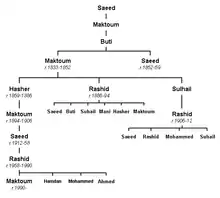 - Noviembre 1912 - 15 de abril de 1929 Jeque Saeed II bin Maktum (1º vez) (n. 1878 - f. 1958)