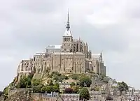 En la primera mitad del siglo XIII la arquitectura normanda mantuvo su originalidad: esbeltez, torres-linternas de base cuadrada (Ruan). Después, se impuso el gótico francés. Las innovaciones hicieron evolucionar los edificios hacia una mayor claridad (supresión de las tribunas, arbotantes). Los reyes y los Grandes financiaron los trabajos: Felipe II Augusto contribuyó a la construcción de la maravilla de Mont-Saint-Michel.[33]