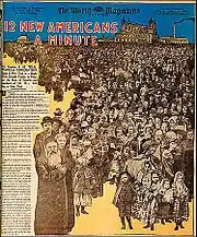 La mayoría de los recién llegados ya tenían una idea de a qué se dirigían, gracias a las cartas familiares y los folletos ampliamente disponibles.[93] La gran mayoría de los viajeros de Europa llegaban a través de la ciudad de Nueva York, y los inmigrantes hacían sus trámites en la isla Ellis. Un pequeño porcentaje fue rechazado debido a una enfermedad evidente; las compañías de barcos de vapor tuvieron que pagar su tarifa, por lo que detectaron a los pasajeros enfermos con anticipación en Europa.[94]
