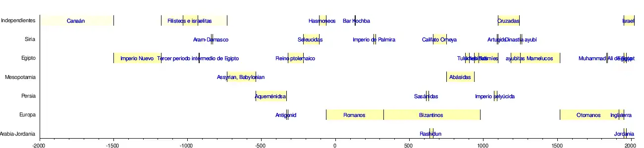 Palestina, definida generalmente como una región geográfica en el sur del Levante entre el mar Mediterráneo y el río Jordán (donde Israel y Palestina están hoy), y varias tierras adyacentes. Situada en un punto estratégico entre Europa, Asia y África, y cuna del judaísmo y el cristianismo,[1] la región tiene una larga y tumultuosa historia como encrucijada para la religión, la cultura, el comercio y la política. En la antigüedad, Palestina fue controlada intermitentemente por varios reinos independientes y numerosas grandes potencias, incluyendo el Antiguo Egipto, Persia, Alejandro Magno y sus sucesores, el Imperio Romano, varias dinastías musulmanas y los cruzados. En la época moderna, la zona estaba gobernada por el Imperio Otomano y luego por el Reino Unido. Desde 1948, Palestina se ha dividido en Israel, Cisjordania y la Franja de Gaza. Otros términos para aproximadamente la misma área geográfica incluyen Canaán, Sion, la Tierra de Israel, el sur de Siria, Outremer y Tierra Santa.