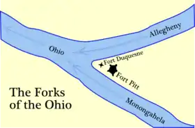 El Gobernador Dinwiddie mando al Capitán William Trent a construir un Fuerte en las horquillas de Ohio. El 17 de febrero de 1754, Trent empezó la construcción del fuerte, la primera vez que el sitio era habitada[15]o por Europeos en lo que ahora es Pittsburgh. El fuerte, llamado Fuerte Prince George, solo fue construido a la mitad para abril de 1754, cuando más de 500 Francés llegaron y ordenaron que los aproximadamente 40 colonizadores regresaran a Virginia. Los Franceses destruyeron la fortificación Británica y construyeron Fort Duquesne.[12][13]