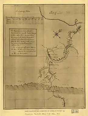 Mientras bajaba de la canoa, me tome un tiempo viendo los Ríos, y las tierras en la horquilla, el cual creo que esta extremadamente bien situado como un fuerte; ya que tiene el absoluto comando de ambos Ríos. El terreno en el punto es de 20 ó 25 pies (7,6 m) sobre la superficie común del Agua; y una considerable fondo plano y lleno de madera alrededor del terreno, muy conveniente para construcción.