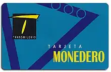 - Tarjeta Monedero: De Angelcom permitía ser cargada con un valor de 50 pesos hasta 85000 pesos. Fue el reemplazo de la Tarjeta Capital a la cual se le recargaba por viajes. Descontinuada su venta desde el 25 de diciembre del 2014. Finalmente dejó de funcionar el 1 de septiembre de 2018.[36][37]