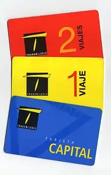 - Tarjeta 1 Viaje: durante la etapa de Angelcom, un tiquete de cartulina, al igual que la tarjeta 1 viaje, podía ser usado solo una vez, tras lo cual recibía una marca para que no pudiera ser usado de nuevo. Únicamente podía ser cargada con un solo pasaje para ser usada una sola vez y devuelta al sistema.