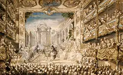 Al inicio de este período predominaba todavía la tragédie-lyrique lulliana, donde destacaba el gusto por el ballet. Así como la ópera italiana solía tener tres actos largos, la francesa tenía cinco cortos, con ballets intercalados.[105] El más destacado operista de esta época fue Jean-Philippe Rameau. Tuvo varios empleos como organista y maestro de capilla en diversas catedrales francesas, al tiempo que escribió diversos tratados de teoría de la música. Hasta los cincuenta años no compuso su primera ópera, Hippolyte et Aricie (1733), a la que siguieron Les Indes galantes (1735), Castor et Pollux (1737) y Dardanus (1739). Tras unos años de inactividad, en 1745 compuso La Princesse de Navarre, Le temple de la gloire —ambas de Voltaire— y la ópera cómica Platée. Entre sus últimas obras destacan Zoroastre (1749) y Les boréades (1763). Las óperas de Rameau gozaron de gran popularidad, al tiempo que suscitaron intensos debates entre sus defensores y detractores: en 1733 se desató la llamada querella de lullystas y ramistas, entre los que abogaban por mantener la tradición operística iniciada por Lully y los que veían con agrado la nueva forma introducida por Rameau, que ponía más énfasis en la música que en el texto.[143] Igualmente, en los años 1750 se planteó la denominada querella de los bufones entre los partidarios de Rameau, defensores de la ópera seria francesa, y el filósofo Jean-Jacques Rousseau y sus seguidores, partidarios de la ópera bufa italiana.[144]