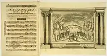 Estas primeras experiencias tuvieron un gran éxito, especialmente entre la nobleza: los Médici se convirtieron en patrocinadores de estos espectáculos y, desde Florencia, fueron extendiéndose por el resto de Italia. Los Gonzaga de Mantua encargaron entonces al famoso compositor de madrigales Claudio Monteverdi una ópera: en 1607 compuso La favola d'Orfeo, con libreto de Alessandro Striggio, una obra ambiciosa compuesta para orquesta de cuarenta y tres instrumentos —incluyendo dos órganos—,[23] con prólogo y cinco actos. En esta obra se imprimieron por primera vez los libretos para que el público pudiese seguir la representación.[24] Monteverdi añadió una introducción musical que denominó «sinfonía», y dividió las partes cantadas en «arias», dando estructura a la ópera moderna.[25] Estas arias se alternaban con el recitativo, una línea musical que incluía partes habladas y cantadas.[26] También introdujo el ritornello, una estrofa instrumental repetida entre los cinco actos.[26] En cuanto a las voces, aunque dejó algunas partes en polifonía, diferenció las principales voces solistas: Orfeo era tenor, Eurídice soprano y Caronte bajo.[23] En 1608, Monteverdi estrenó L'Arianna, con libreto de Rinuccini, de la que no se ha conservado la música, excepto un fragmento: el Lamento d'Arianna.[23]