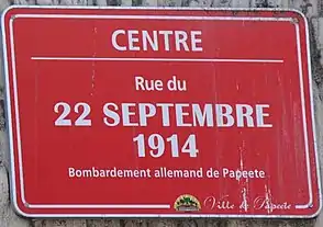 En 1914, Papeete es bombardeada por dos cruceros de la Marina alemana que buscaban apoderarse de las reservas de carbón. Este está incendiado mientras que los cañones de marina, instalados en tierra, disparan los buques alemanes. En represalias, éstos bombardean la ciudad y después se retiran. Una nave alemana que había sido apresada algunos días antes es hundida en el puerto así como una cañonera francesa.