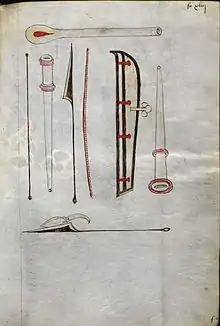 cinco ungüentos: de albahaca, para madurar el pus, de los apóstoles[35] para purificar, dorado, para fomentar el crecimiento de los tejidos, blanco para curar, y de dialtea para sudar. Así como cinco herramientas: tenacillas, sonda, cuchilla, lancetas y agujas