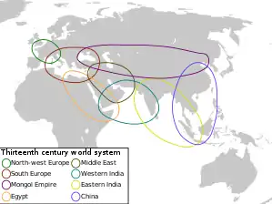La llegada del Imperio Mongol, a pesar de desestabilizar los centros comerciales de Medio Oriente y China, facilitó mucho el viaje a través de la Ruta de la Seda. Esto permitió a los viajeros y misioneros como Marco Polo viajar con éxito (y rentáblemente) de una punta de Eurasia a la otra. La Pax Mongólica del siglo XIII tuvo muchos otros notables efectos a nivel mundial. Fue la época de la creación del primer servicio postal internacional, y también de la rápida trasmisión de epidemias como por ejemplo la peste bubónica a través de las recién unificadas regiones de Asia Central.[8] [9] Estas fases premodernas de intercambio global son conocidas a veces como globalización arcaica. Sin embargo, volviendo al siglo XVI, incluso el más expandido sistema de intercambio estaba limitado al Viejo Mundo.