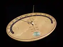 Los avances en cartografía geodésica, la elaboración de mapas y globos terráqueos con diversas proyecciones influye en el avance de la gnomónica aumentando el diseño de nuevos relojes. El matemático inglés William Oughtred (inventor de la regla de cálculo) publica en 1636 un nuevo reloj que mide las horas siguiendo el azimut de las sombras. Esta descripción la realiza en un libro titulado The Description and Use of the Double Horizontal Dial. Oughtred diseña además un reloj solar portátil inspirándose en la teoría del astrolabio marinero,[35] desarrolla el anillo equinoccial universal llegando a ser muy popular a comienzos del siglo xvii en toda Europa. Los relojes de sol diseñados comienzan a emplearse y diseñarse como instrumentos de localización, algunos de ellos poseen gran precisión, surgen los relojes solares azimutales.[36] Ya en el siglo xvi Gemma Frisius contribuyó con el diseño de relojes capaces de ubicar y calcular algunos parámetros del movimiento solar: anillo astronómico (denominado también anillo de Gemma). En Estados Unidos el joven Benjamin Franklin era un iniciado entusiasta de la gnomónica, haciendo que en 1787 se pusiera en el anverso de la primera moneda estadounidense un reloj de sol: el Fugio Cent. Esta moneda tenía como seña: "Mind Your Business".[37] El tercer presidente de Estados Unidos, Thomas Jefferson durante una estancia por enfermedad diseña un reloj de sol horizontal capaz de indicar los cinco minutos.