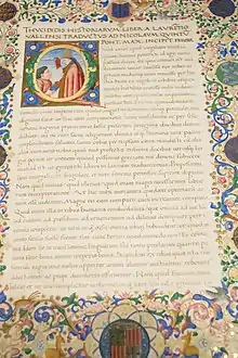 Manuscrito de la Historia de la Guerra del Peloponeso del historiador Tucídides, versión latina traducida por Lorenzo Valla y dedicada al papa Nicolás V.