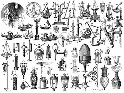 Pero también estaban muy extendidas las lámparas de aceite, como la lámpara Cardan y, a partir de 1783, la lámpara Argand.[2] A finales del siglo XVIII, el suizo Aimé Argand desarrolló una mecha redonda que, gracias al mayor suministro de oxígeno, permitía una temperatura de combustión más alta y, por lo tanto, una combustión más limpia del combustible. Un cilindro de vidrio deslizado sobre la llama calmaba el proceso de combustión y por lo tanto la emisión de luz, y un mecanismo giratorio permitía subir o bajar la mecha y así producir más o menos luz. El filósofo francés Marquer admiró la lámpara de Argand en 1793: «El efecto de esta lámpara es particularmente hermoso. Su luz extraordinariamente brillante, vívida y casi cegadora supera la de cualquier lámpara estándar, y no emite humo... Además, no pude detectar el más mínimo olor alrededor de la llama.» Después del descubrimiento de los campos petrolíferos de Pensilvania, se prefirió el petróleo al aceite orgánico como combustible barato y limpio. La lámpara de queroseno, que entonces estaba muy extendida, ardía según el principio de Argand.