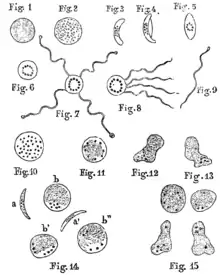 En 1848, el anatomista alemán Johann Heinrich Meckel[63] registró gránulos pigmentados de negro y marrón en la sangre y el bazo de un paciente que había muerto en un hospital psiquiátrico. Se cree que Meckel estuvo examinando parásitos de la malaria sin darse cuenta; él no mencionó a la malaria en su reporte. Él planteó la hipótesis de que la pigmentación era melanina.[64] La relación causal del pigmentos con el parásito se estableció en 1880, cuando el médico francés Charles Louis Alphonse Laveran, trabajando en el hospital militar de Constantina, Argelia, observó parásitos pigmentados adentro de las células rojas en la sangre de pacientes sufriendo de malaria. Fue testigo de hechos de esflagelación y se convenció de que los flagelos móviles eran microorganismos parásitos. El notó que la quinina elimina los parásitos de la sangre. Laveran llamó, a estros organismos microscópicos, Oscillaria malariae y propuso que la malaria era causada por este protozoo. [65] Este descubrimiento se mantuvo en polémica hasta el desarrollo del aceite de inmersión, en 1884, y el desarrollo de mejores métodos de tinción de 1890 a 1891.
