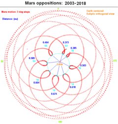 Estos gráficos muestran la dirección y la distancia de Marte en relación a la Tierra en el centro, con oposiciones y movimientos retrógradas aparentes aproximadamente cada dos años y oposiciones cercanas que ocurren cada 15-17 años debido a la órbita excéntrica de Marte. |