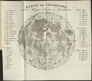 Ya en el siglo XIX se confeccionaron importantes cartas lunares: W. G. Lohrmann dispuso de su propio mapa de 97 centímetros en el año 1824; en 1837 aparece el "Mapa Selenographica" realizado por Wilhelm Beer y Johann Mädler,[4] que fue una verdadera obra maestra en cuanto a su presentación se refiere, con una altura de 95 centímetros y dividida en cuatro partes,[4] obra que sería completada con su libro Der Monde (La Luna).