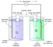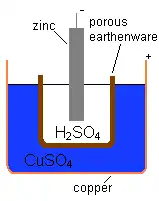 Un químico británico llamado John Frederic Daniell buscó una manera de eliminar el problema de las burbujas de hidrógeno que aparecen en la pila voltaica, y su solución fue utilizar un segundo electrolito para consumir el hidrógeno producido por el primero. En 1836, inventó la pila Daniell, que consistía en una vasija de cobre llena de una disolución de sulfato de cobre (II), en el que se sumerge un recipiente de barro sin esmaltar lleno de ácido sulfúrico y un electrodo de zinc. La barrera de barro era porosa, lo que permitía a los iones pasar a través suya, pero impedía la mezcla de las dos disoluciones. Sin esta barrera, cuando no había corriente se comprobó que los iones de cobre (II) se derivaban hacia el ánodo de zinc y sufrían la reducción sin producir una corriente, destruyendo la vida de la batería.[7]