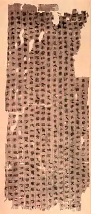 El papel fue con toda seguridad uno de los mayores descubrimientos de los chinos. Desde el siglo III a. C. se fabricaban en Asia todo tipo de papeles a pequeña escala con los más diversos materiales.[7] El papel hecho con corteza de morera data del siglo II a. C. Seda, bambú, lino, paja de arroz o trigo se usaron indistintamente. El papel hecho con seda se convierte así en el primer papel de lujo. Se han hallado en la tumba de una marquesa muerta hacia el año 168, en Mawangdui (Hunan), pruebas de escritura sobre seda de esa época (ver imagen). El material era ciertamente más caro, pero también más práctico que el bambú. Así, se han descubierto tratados sobre diversas ciencias (meteorología, medicina, astrología, adivinación...) o incluso mapas[8] cuyo soporte era la seda.[9]