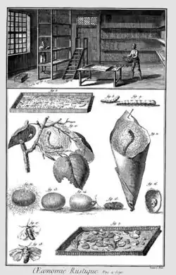En el siglo XVIII, mientras la cría del gusano de seda y la fabricación del tejido de seda se extendían con rapidez en Francia, los enciclopedistas del Siglo de las Luces escriben un exhaustivo artículo acerca de la seda. El artículo "seda" de la Enciclopedia de Diderot y d'Alembert se inicia con una breve historia de la seda, antes de pasar a describir todas las prácticas y técnicas. Centrado fundamentalmente sobre la difusión del tejido en Europa, este texto nos informa acerca de conocimientos de la época, algunos de ellos falsos.
