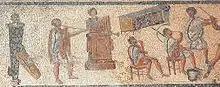 - El hydraulis, un instrumento de teclado, el precursor del órgano moderno. Como su nombre lo indica, el instrumento usó agua para suministrar un flujo constante de presión a las tuberías. Han sobrevivido dos descripciones detalladas: la de Vitruvio [17] y la Garza de Alejandría. [18] Estas descripciones se refieren principalmente al mecanismo del teclado y al dispositivo por el cual se suministró aire al instrumento. Se encontró un modelo bien conservado en cerámica en Cartago en 1885. Esencialmente, el aire a las tuberías que producen el sonido proviene de un cofre de viento conectado por una tubería a una cúpula; se bombea aire para comprimir el agua, y el agua se eleva en el domo, comprimiendo el aire y provocando un suministro constante de aire a las tuberías. [19]