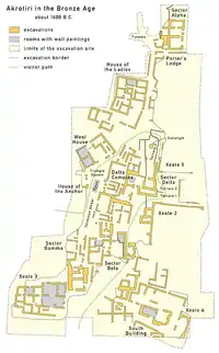 La erupción en Santorini (entre el periodo Minoico tardío IA y el Minoico tardío IB) enterró y preservó una ciudad: Akrotiri. Las excavaciones que han tenido lugar desde 1967 han descubierto un área edificada que cubre una hectárea, sin contar el muro defensivo.[29] El plano de la ciudad estaba formado por una red más o menos ortogonal de calles pavimentadas equipadas con canales de drenaje. Los edificios tenían de dos a tres pisos y carecían de tragaluces y patios; las aberturas en la calle les proveían siempre de aire y luz. La planta baja contenía la escalera y habitaciones que servían de tiendas o talleres; las habitaciones en la planta siguiente, un poco más grandes, tenían un pilar central y estaban decoradas con frescos. Las casas tenían tejados con terrazas colocados sobre vigas que no eran perpendiculares. Estaban cubiertas con una capa vegetal (algas marinas u hojas) y luego varias capas de arcilla,[29] práctica que continúa en las sociedades tradicionales hasta nuestros días.