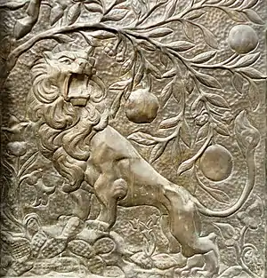 - Mosaico con texto hebreo custodiado por los leones de Judá, proveniente de la Sinagoga de Hamat Gader, siglo V-VI
