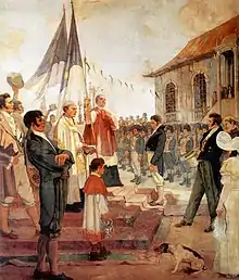 El 26 de abril, un domingo (el de Pascua), fue oficiada la primera misa en el suelo brasileño por fray Henrique Soares (o por fray Henrique de Coímbra),[51] que predicó sobre el Evangelio del día. Bautizaron la tierra como la Ilha da Vera Cruz el 1 de mayo y, en una segunda misa, Cabral tomó posesión de la tierra en nombre del rey de Portugal. En el mismo día, los navíos partieron, dejando en la tierra al menos dos desterrados y dos grumetes que habían huido de bordo. Cabral partió hacia la India por la vía cierta que sabía existía a partir de la costa brasileña, es decir, cruzó otra vez el océano Atlántico y costeó África.