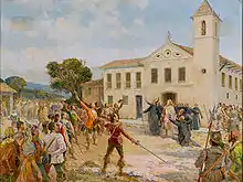 La mayoría de historiadores afirman que el descubridor de Brasil fue el navegante español Vicente Yáñez Pinzón,[4] que el 26 de enero de 1500 desembarcó en el cabo de San Agustín, en el litoral sur de Pernambuco —esta considerado como el viaje más antiguo comprobada al territorio brasileño.[2][42][44][45] Siguió luego viaje e hizo una primera exploración de toda la costa hasta la desembocadura del río Amazonas, donde le adelantó su primo Diego de Lepe, cuya expedición seguía su estela.[4][46] y este viaje se ve reflejado en los Pleitos Colombinos.[47] Sin embargo, para la historiografía luso-brasileña, Brasil fue descubierto el 22 de abril de 1500, por el capitão-mor de una expedición portuguesa en busca de las Indias, Pedro Alvares Cabral, que llegó a la costa sur de Bahía, en la región de la actual ciudad de Porto Seguro, más precisamente en el distrito de Coroa Vermelha.[48][49] Fue él quien tomará «formalmente» el territorio en nombre de su país.
