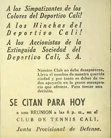 Para salvar la institución, se formó la Junta Provisional de defensa del Deportivo Cali, la cual por medio de publicaciones en la prensa convocó el 31 de enero a las 6:00 p. m., una reunión en el Club de Tenis de Cali, a todo aquel interesado en salvar al equipo. En la reunión, a la cual habían asistido el liquidador, los directivos y otros interesados, se decidió invitar al todavía presidente de la institución, Carlos Sarmiento Lora, y una vez este estuvo en el lugar, el representante de la familia Urdinola leyó públicamente una carta dirigida a Sarmiento Lora, en el cual le pedía no renunciar a las riendas de la institución. Luego de la lectura de la carta, a la cual se habían adherido Juan Manfredi y Germán Vélez, Sarmiento Lora agradeció y aseveró continuar dirigiendo al club.[5]