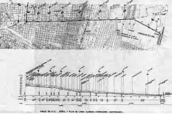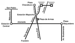 - Una línea norte-sur que se inicia en la avenida La Paz (desde donde se proponían 2 ramales hacia el norte: uno por avenida Independencia y otro por avenida Recoleta), sigue por calle Bandera y San Diego (desde donde surgirían 2 ramales hacia el sur: uno por la Gran Avenida, y el otro que iría por la entonces avenida San Joaquín hasta el sector de La Legua)
