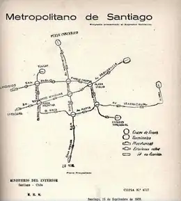Los primeros planteamientos respecto a la necesidad de construir una red de transporte subterráneo en Santiago de Chile datan de la década de los años 1920. El primer proyecto para crear una línea de ferrocarril subterráneo por la Alameda, desde la Plaza Argentina (en las cercanías de la Estación Central de Santiago) hasta la iglesia de San Francisco, fue planteado por Hernán Edwards Sutil en 1917. El segundo proyecto fue creado por Luis Lagarrigue —quien estaba asociado con Siemens— en octubre de 1924 —presentado nuevamente al año siguiente—[9] y constaba de dos líneas perpendiculares: la primera era subterránea en sentido poniente-oriente y conectaría la Estación Central de Santiago con la Plaza Italia a lo largo de la Alameda de las Delicias (planteándose ramales por General Bustamante y por Matucana hacia San Pablo) y otra elevada en dirección norte-sur entre la Plaza Chacabuco y el Matadero, utilizando las avenidas Independencia y San Diego, planteándose también alternativas por Arturo Prat, Ahumada y La Paz. Una tercera línea planificada sería de circunvalación. El decreto del 9 de diciembre de 1926 otorgó la concesión a Lagarrigue para construir el ferrocarril subterráneo,[10][11] sin embargo el proyecto finalmente naufragó en 1928,[8] pero sentó las bases para los proyectos futuros que seguirían una estructura similar y que finalmente sería construida varias décadas después.[12]