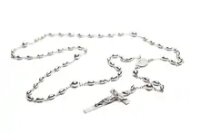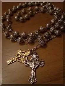 Durante la Edad Media , la evidencia sugiere que tanto el Padre Nuestro como el Ave María se recitaban con cuentas de oración. En el siglo XIII en París , existían cuatro gremios comerciales de fabricantes de cuentas de oración, a quienes se les conocía como paternósteros , y las cuentas se denominaban paternósters , lo que sugiere un vínculo continuo entre el Padre Nuestro ( Pater noster en latín) y la oración del rosario.[10]
