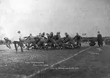 Mientras tanto, John H. Outland celebró un partido experimental en Wichita, Kansas en el cual redujo el número de tacleadas requeridas para obtener una primera y cuarta en un intento para reducir las lesiones.[64] El diario Los Angeles Times informó un aumento de patadas de despeje y un juego mucho más seguro que el juego regular, pero que la nueva norma no era "conducente para el deporte".[65] Por último , el 28 de diciembre de 1905, 62 escuelas se reunieron en la ciudad de Nueva York para discutir cambios en las reglas para hacer el juego más seguro. Como resultado de esta reunión, se formó el Intercollegiate Athletic Association de los Estados Unidos , más tarde llamado la National Collegiate Athletic Association (NCAA).[66] El cambio de una norma introducida en 1906, ideada para abrir el juego y reducir las lesiones, fue la introducción del pase adelantado. Aunque fue poco utilizado por años, esto resultó ser uno de los cambios en las reglas más importantes en la creación del juego moderno.[67]