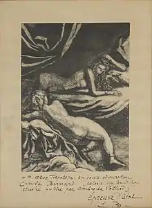 La siguiente generación, a caballo entre los siglos xviii y xix, es la de los neoclásicos, entre los que cabe citar a: Jacques-Louis David, considerado el padre del Neoclasicismo francés, un pintor de cuadros históricos de estilo sobrio, realizó algunos aguafuertes de tono caricaturesco (Gobierno inglés, 1793-1794; El ejército de las tinajas, 1793-1794);[114] Pierre-Paul Prud'hon, que practicó esporádicamente el grabado, en calcografía (Phrosine et Mélidor) o litografía (Una lectura, La familia desgraciada);[115] Anne-Louis Girodet-Trioson ilustró libros de Virgilio, Anacreonte, Racine y otros escritores, que fueron editados por los hermanos Didot, tarea en la que también intervino François Gérard;[116] Pierre-Narcisse Guérin fue comisionado por el gobierno francés para elaborar un informe sobre el nuevo método de la litografía, para lo que realizó varios ensayos, como el Perezoso y el Vigilante.[117]