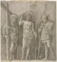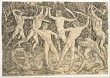 La cuna del Renacimiento fue Italia, país en que, como se ha visto en el apartado anterior, se empezó a practicar el grabado en fecha posterior a los países del Rhin, pero que pronto alcanzó cotas de gran calidad gracias al genio de sus artistas, que iniciaron en el siglo XV una revolución en las artes plásticas de gran relevancia. El principal centro productor en los inicios del grabado renacentista italiano fue Florencia, donde en el siglo XV surgieron dos estilos: el «estilo fino», realizado por orfebres y muy marcado por la técnica del nielado; y el «estilo amplio», más usado por artistas e influido por el dibujo a la pluma.[23] En este último se enmarca la obra de Antonio Pollaiuolo: realizó pocos grabados, pero de gran calidad artística, como El combate de los centauros, Hércules y Anteo y El combate de los hombres desnudos, obras que denotan un gran estudio anatómico de la figura humana.[33] También practicó el mismo estilo Andrea Mantegna, natural de Padua, un hábil grabador, de estilo clasicista y corte realista, expresivo y delicado, con trazo sobrio y limpio, en temas religiosos y profanos. Entre sus obras destacan: La Virgen Madre, Cristo entre san Andrés y san Longinos, El triunfo de Julio César, Bacanal y Combate de los dioses marinos. Tuvo varios discípulos e imitadores, como Cima da Conegliano, Girolamo Mocetto y Giovanni Antonio da Brescia.[34]