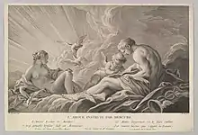 El rococó surgió en Francia, donde el grabado vivió en esta centuria una edad de oro.[112] En esta época se ensayaron nuevas técnicas de grabado: en 1704, Jacob Christoph Le Blon experimentó con la impresión en colores unida a las medias tintas; Jean-Charles François combinó el barniz blando y el rodillo en lo que llamó «grabado al estilo del lápiz», e intentó una aguada de aguafuerte al pincel cercana ya a la aguatinta, método que perfeccionó Jean-Baptiste Le Prince.[110] En la transición entre los siglos xvii y xviii destacó la obra de Claude Gillot, artífice del cambio de gusto en la ilustración por un estilo ornamental y recargado, aplicado tanto a libros como ex-libris, etiquetas, tarjetas de visita, menús, invitaciones, etc. Dos destacados pintores del rococó se dedicaron también al grabado, como Jean-Antoine Watteau y François Boucher. El primero fue el iniciador de la fête galante («fiesta galante»), un género caracterizado por la representación de escenas cortesanas ambientadas en paisajes bucólicos, en el que realizó obras como Figuras de modas y Figuras francesas y cómicas, ayudado por grabadores como François Joullain, Louis Desplaces y Henri Simon Thomassin. Boucher, quizá el mejor aguafortista de la primera mitad del siglo XVIII en su país, se dedicó sobre todo a la reproducción de la obra de Watteau, con una serie de 125 aguafuertes con el método del grabado al estilo del lápiz. Otros intérpretes de la obra de Watteau fueron Laurent Cars y Anne Claude de Caylus. En este período cabe recordar también la obra de dos sobrinos de Gérard Audran, Jean Audran y Benoît Audran el Viejo, de hábil precisión y perfección técnica. Cabe mencionar también que el grabado fue practicado como afición por miembros de la aristocracia, como Madame de Pompadour —que grabó algunos dibujos de Boucher—, Felipe II de Orleans —quien ilustró en 1718 el libro Dafnis y Cloe— o la duquesa de Luynes. En la segunda mitad del siglo destacó la obra de Jean-Honoré Fragonard, todavía en estilo rococó, autor de escenas cortesanas en frondosos paisajes. Pierre-Philippe Choffard fue un reputado dibujante y aguafortista, autor de la Notice sur l'art de la gravure en France. En los últimos decenios, la obra de Jean-Michel Moreau, Charles-Nicolas Cochin, Augustin de Saint-Aubin y Charles-Clément Bervic se acerca ya al Neoclasicismo. Durante la Revolución francesa cabe destacar la serie de doscientos grabados de Cuadros históricos de la Revolución francesa (1791), de Jean Duplessis-Bertaux.[113]