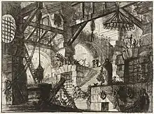En Italia destaca la escuela aguafortista veneciana, cuya especialidad fueron las vedute, las vistas de Venecia.[110] Sus dos principales representantes fueron Canaletto y Giovanni Battista Tiepolo. El primero realizó luminosas vistas de su ciudad, en general con pequeños grupos de personas y amplias perspectivas de los palacios y canales venecianos. Tiepolo contó con una gran fantasía creadora, en imágenes de audaz composición en que destacan la viveza de los movimientos y una luminosidad fulgurante (Caprichos, Scherzi di fantasia). Sus hijos y discípulos Giovanni Domenico y Lorenzo Tiepolo siguieron sus pasos. También cabe citar en Venecia a Luca Carlevarijs, Michele Marieschi y Giovanni Marco Pitteri.[118] En Roma destacó la obra de Giovanni Battista Piranesi, veneciano de origen, autor de unas famosas series de grabados de vistas romanas (Vistas de Roma, Magnificencia de la arquitectura romana), así como otras de gran inventiva sobre cárceles de fantasía surgidas de su imaginación (Prisiones de invención). Cabe citar también a Giovanni Volpato, intérprete de obras de Rafael, Claudio de Lorena y Anton Raphael Mengs; y su discípulo, Raffaello Sanzio Morghen, un gran burilista de exquisita factura.[119]