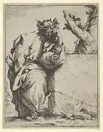 De entre todos ellos el más dedicado al grabado fue José de Ribera, un artista de fuerte personalidad. Residió un tiempo en Italia —donde era conocido como Lo Spagnoletto—, donde recibió la influencia de Caravaggio, que le llevó a la utilización de fuertes claroscuros en su obra, generalmente de tema religioso. Realizó numerosos grabados, de estilo realista y vehemente ejecución, entre los que cabe destacar San Jerónimo penitente, Martirio de San Bartolomé, Jesucristo moribundo, San Sebastián y San Pedro, así como varios de tema profano: Centauro, Tritón, Sileno, Sátiro fustigado y su magnífico El poeta.[103]